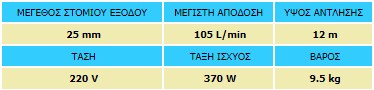 - Πλήρως βυθιζόμενη, με ικανότητα άντλησης άνω των 100 L νερού ανά λεπτό.