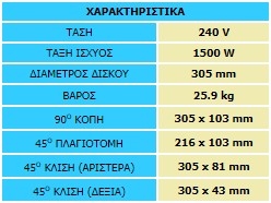 - Κόβει σε πλάτος έως και 305 mm και πάχος έως και 102 mm στις 90°.